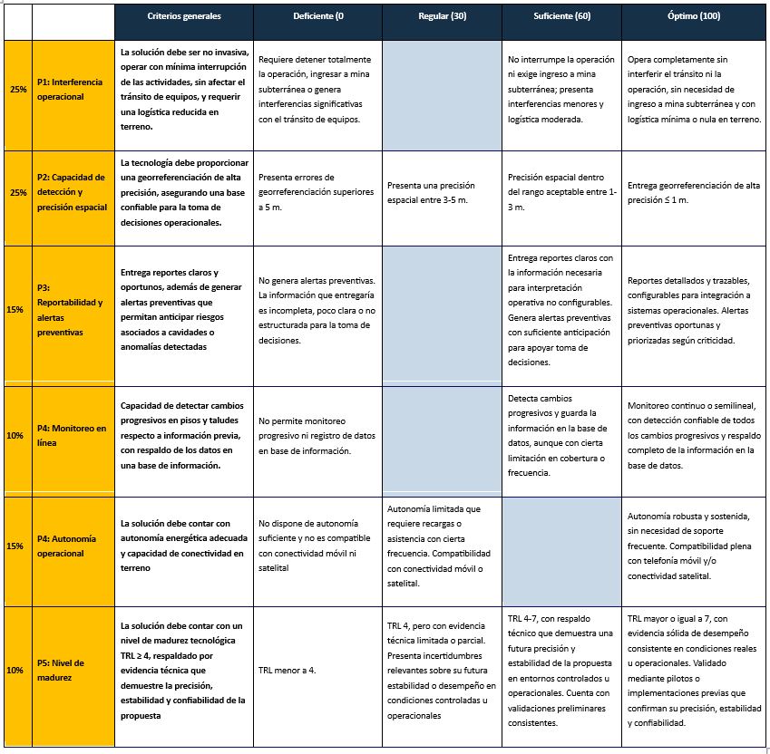 El objetivo de esta convocatoria es identificar tecnologías capaces de detectar, delimitar y caracterizar cavidades y laboreos subterráneos no identificados en macizos rocosos in-situ y en materiales de subsidencia por debajo del Rajo Inca, con el propósito de implementar medidas preventivas que permitan mantener condiciones operacionales seguras. La información obtenida debe integrarse de manera compatible con las plataformas existentes, permitiendo realizar análisis geotécnicos y generar alertas tempranas de riesgo.