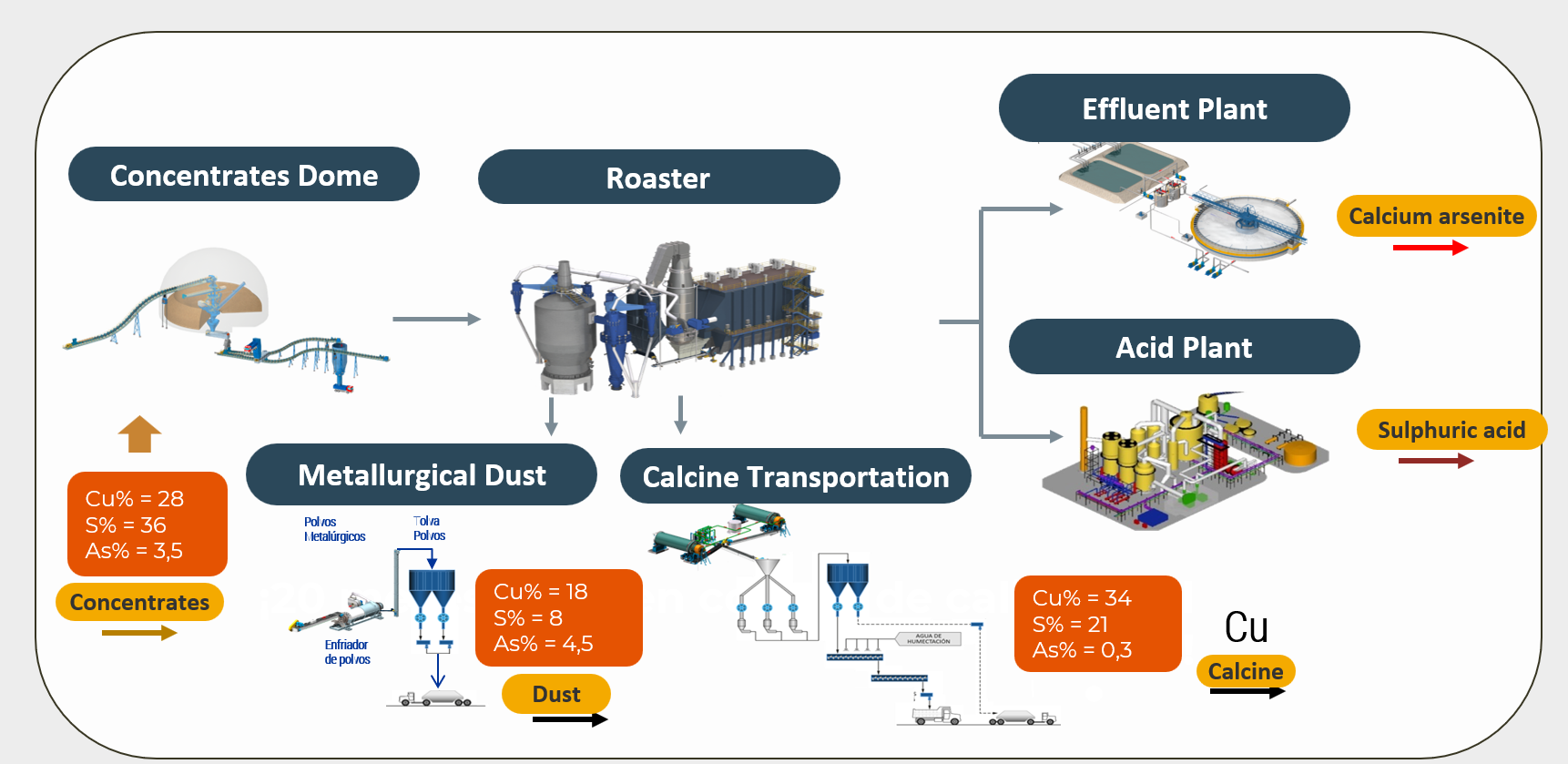 El proyecto busca ofrecer un proceso industrialmente viable que se integre perfectamente con las operaciones de la planta existente, sea escalable a volúmenes actuales y futuros, y contribuya a alcanzar estrictos objetivos de cumplimiento ambiental para la gestión del arsénico.